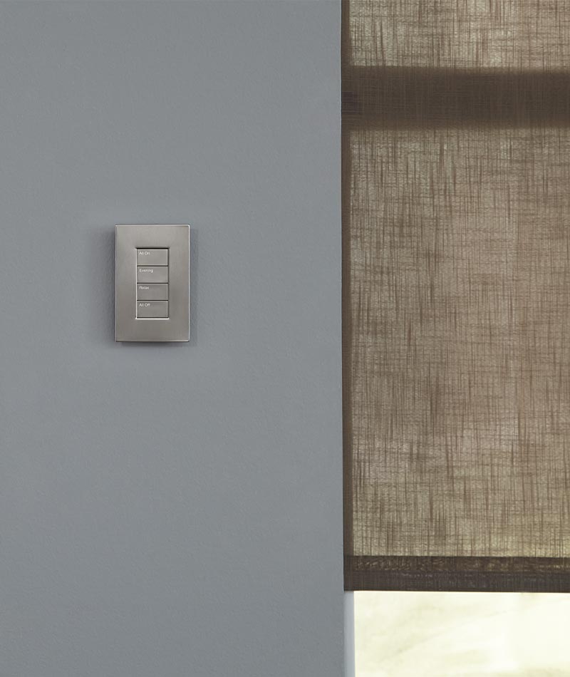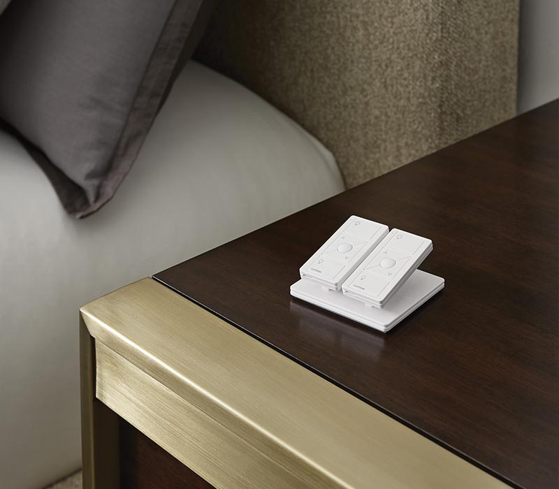 The Lutron Pico remote control allows you to raise and lower the shades in your home with the press of the button. The Lutron app for your smart phone or tablet allows for the same, in addition to scene setting, time schedules, and integration with other technology systems in your home.